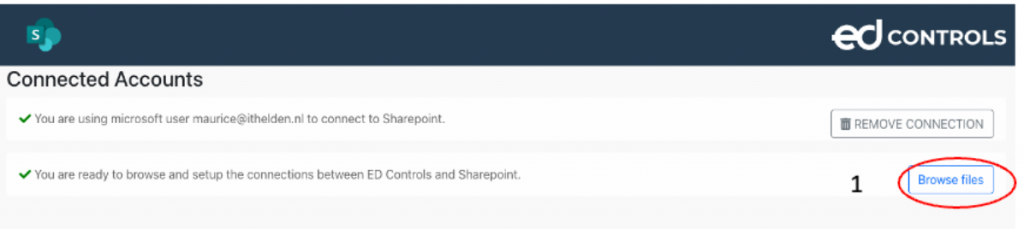 To get files from SharePoint to Ed Controls, the metadata columns in SharePoint must be "connected" to the Groups in Ed Controls, click on "Browse files" to files (1) to make this connection.